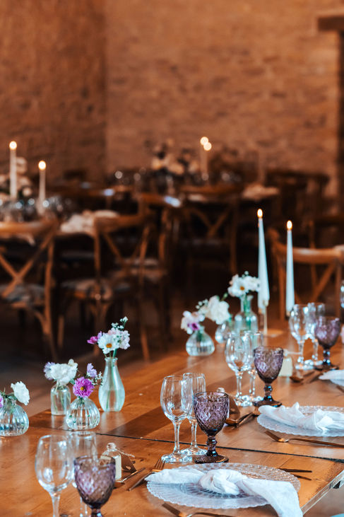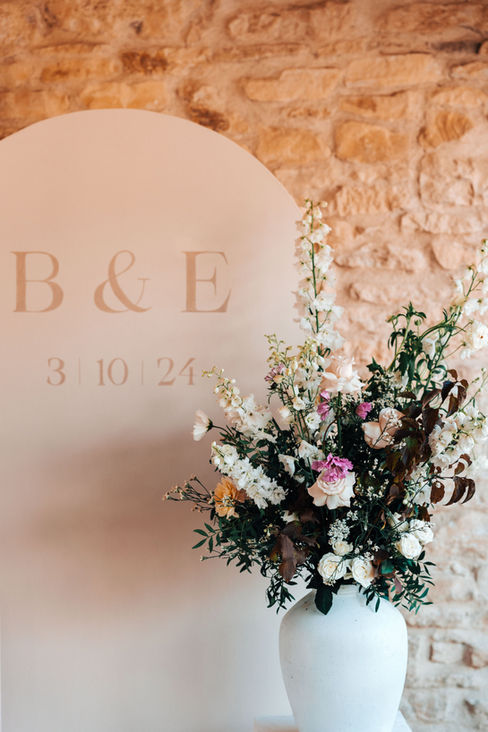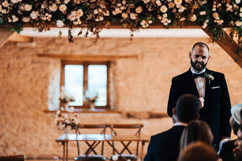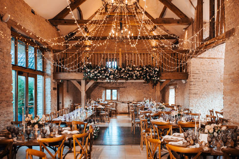 Ben and Emily’s wedding at The Kingscote Barn was a breathtaking celebration, filled with stunning floral arrangements and exquisite table styling. The tables were elegantly set with glass chargers and gold cutlery, creating a luxurious yet understated atmosphere. Floral napkins added a charming, personal touch, complementing the vibrant blooms that adorned every corner of the venue. The couple’s choice of wedding flowers created a romantic and fresh ambiance, with soft pastels and lush greenery enhancing the rustic beauty of The Kingscote Barn. This wedding was a perfect example of how thoughtful styling and flowers can transform a space into a dreamlike setting.