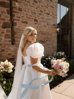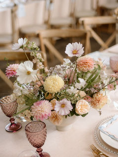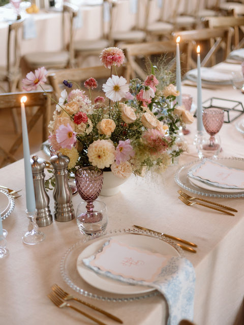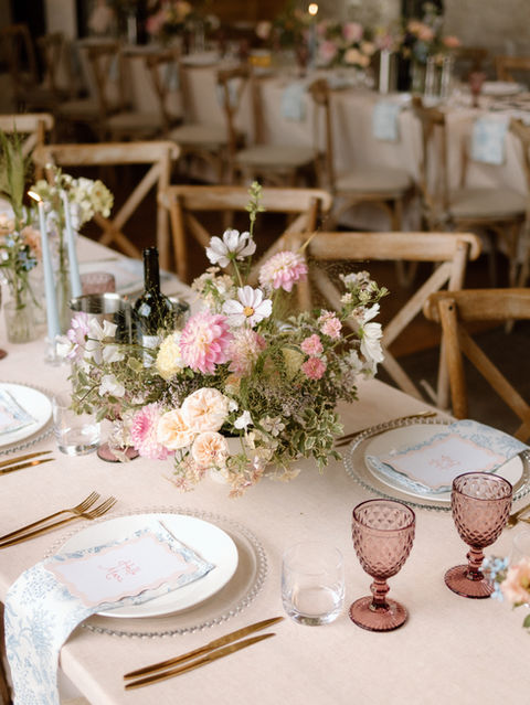 Charlie and Josh celebrated their wedding at the beautiful Llantilio House, surrounded by the season’s soft pastel blooms that created the perfect backdrop for their wedding flowers and venue styling. Their tables were thoughtfully designed with our luxe creamy tablecloths, elegant charger plates, pink goblets and floral napkins, bringing together a cohesive look that highlighted both our romantic, natural floristry work and bespoke wedding styling. The result was a refined atmosphere that showcased the very best in wedding venue styling and floral design.